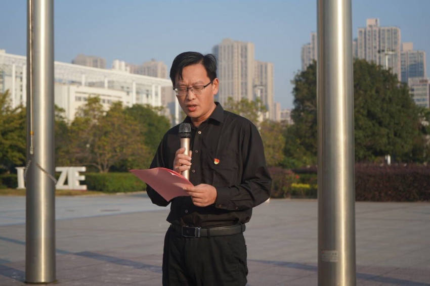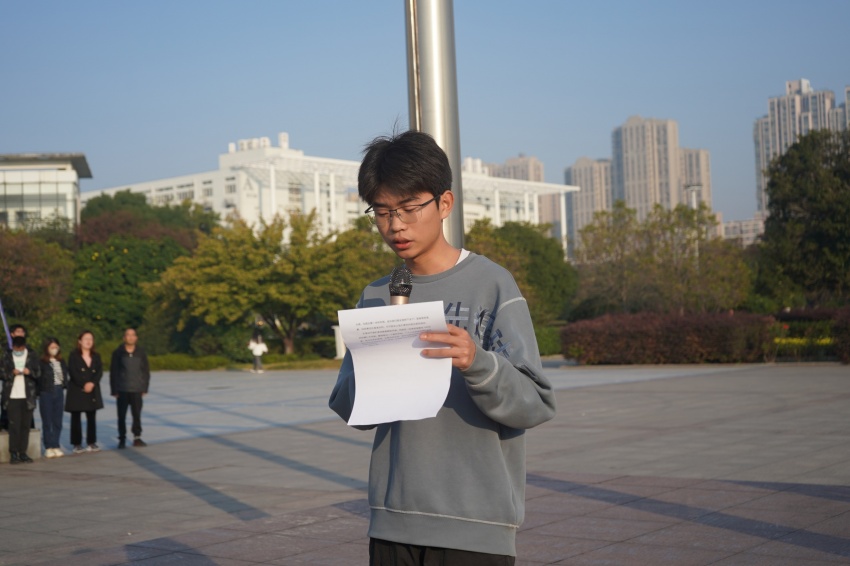随后,化学工程(本科)2211班赵辉同学代表全体在校生作国旗下发言。他结合自己一年的学习生活,号召全体同学心怀梦想,脚踏实地,以公司“励志·践行”校训为指引,担负时代责任,做一名新时代合格的老员工。
